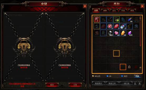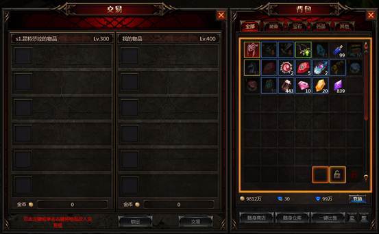 1. 交易界面中左侧显示的是对方要付出的物品或金币,右侧是你要放入的物品或金币