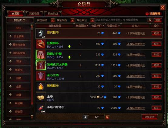 1. 如果你是一名屌丝,没有钻石怎么办?来交易行做商人吧,把你打到的好装备好材料,通通挂上去卖,用不了多久,钻石就会乖乖钻进你的口袋!
