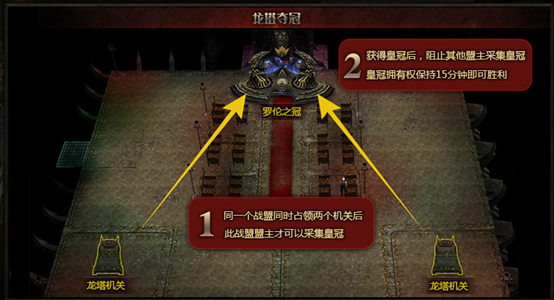 3. 任何一方战盟同时占领两个机关后,此战盟的盟主方可开始采集皇冠。