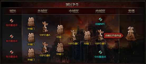 1. 攻击方攻破内城区的守护石像后,攻城战即进入龙塔夺冠阶段。